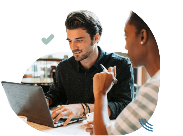 Two people sit at a table working together, one using a laptop while the other holds a pen. A cup and papers are on the table, and graphic elements surround the scene.